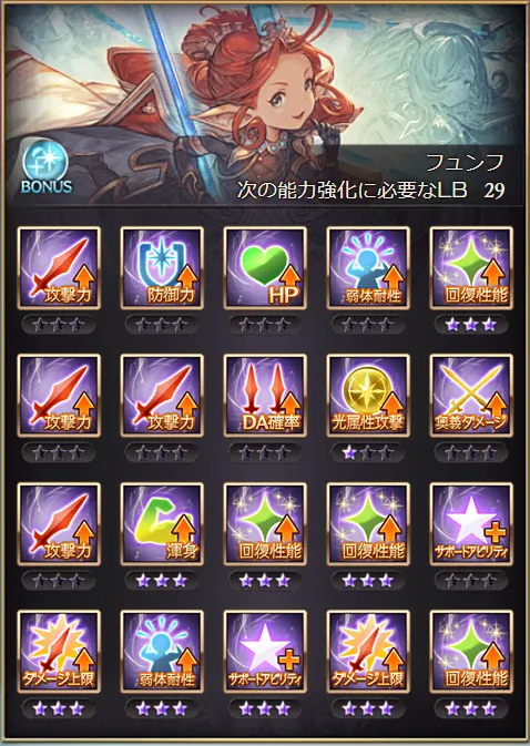 | 無属性に対する与ダメUPも重要。 天元を周回して、なんとか素材を集めよう。 | |