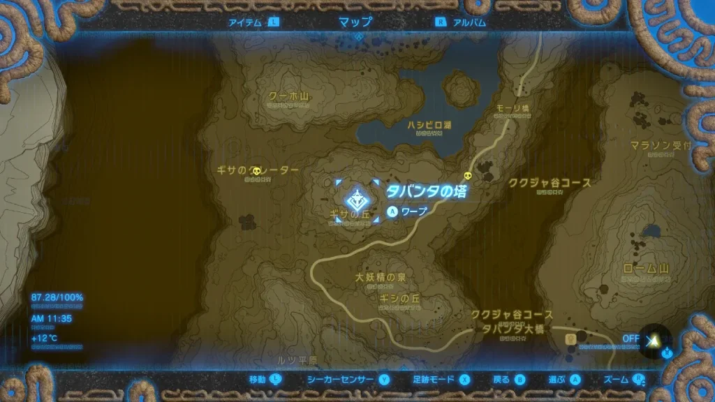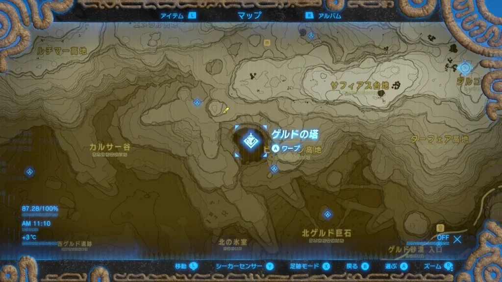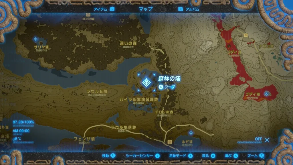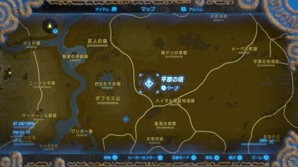 - ハイリア山から西に降り、崖を登って荒野の塔を解放。