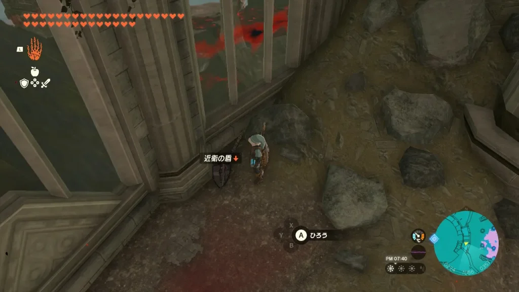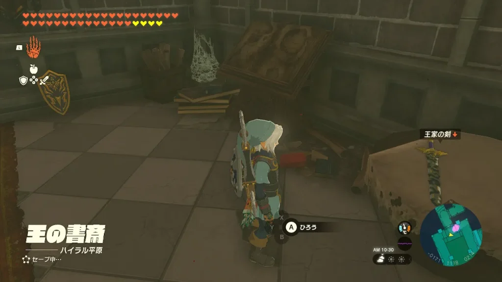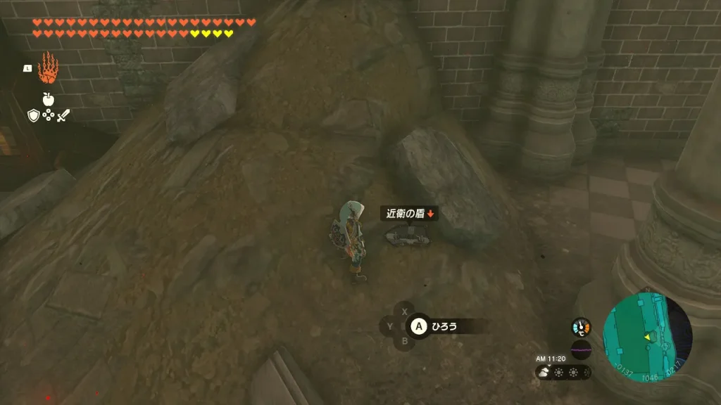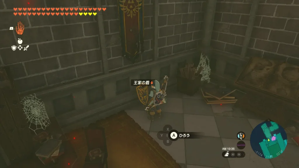図書室(王の書斎とは反対側)の瓦礫の上に近衛の盾が落ちています。